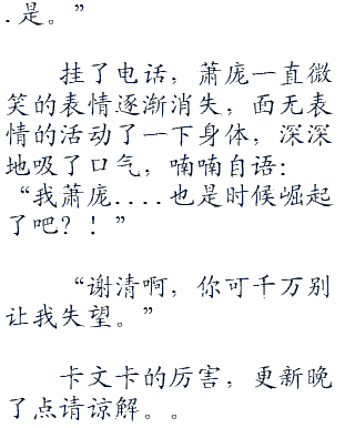 感觉自己的写作状态有些太过差劲了,本来这两章是塑造少女形象的重要章节,可我怎么写都写不出感觉来,只能先如此了,日后再做弥补。看来人家常说发烧会烧坏脑袋,是真的啊,感觉自己脑袋的确有点转不动了。这几天努力调整身体和写作状态,过几天开始三更。