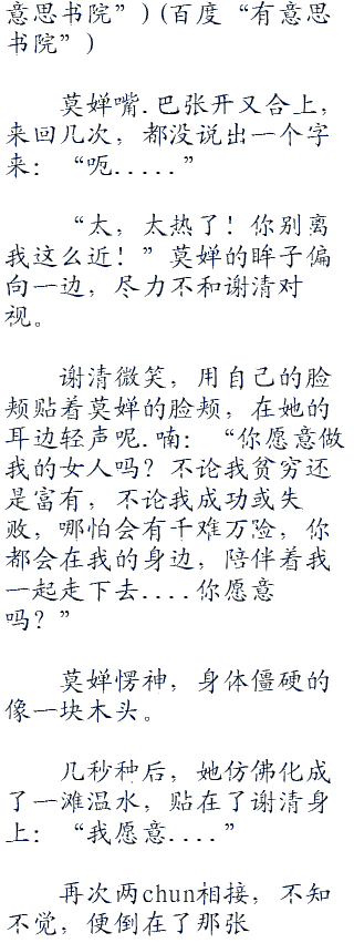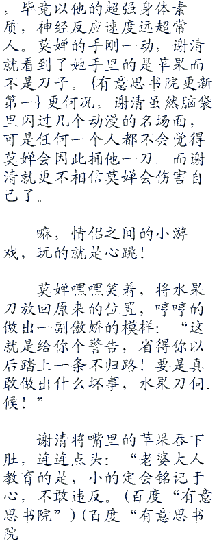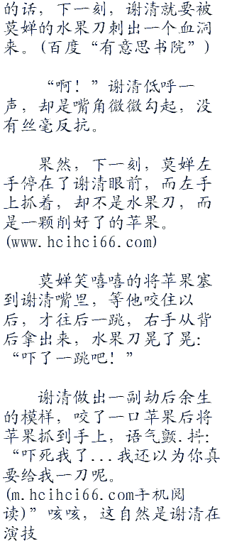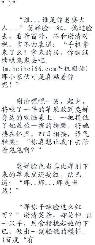 谢清听到莫婵嘴里说出:算是你的人了,顿时感觉心脏一个荡漾,忍不住露出嘿嘿的笑容,暗自感叹:前十几年,作为一个宅男,虽然也有过感情纠纷,但是头一次有妹子对咱说我是你的人呢!