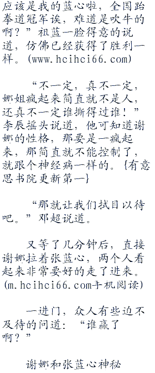 “应该是我的蓝心啦,全国跆拳道冠军诶,难道是吹牛的啊?”祖蓝一脸得意的说道,仿佛已经获得了胜利一样。