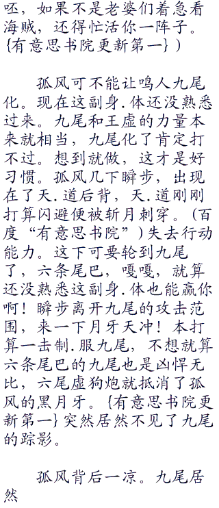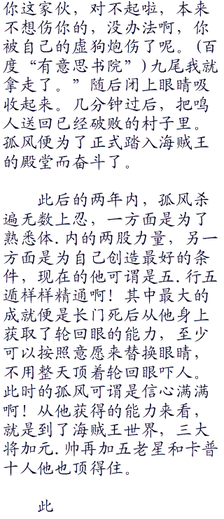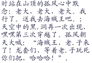 想到海贼王,孤风笑了笑,的确。他的十八年历程中,基本上就没有出现过什么情绪,只有当看海贼王的时候,他才会开心地笑,才会从心底里热血沸腾,如果没有海贼王,恐怕他会怀疑自己究竟是不是人。回想完海贼里面的一切,他心中默念:海贼王再见了,路飞再见了,希望你哥.哥没死,你能顺利当上.海贼王。娜美再见了,希望你以后别再那么贪.财。罗宾,再见了,和我同样命运的可怜人。汉库克,再见了,如果我能来海贼,一定要把你收掉。(孤风除了路飞以外,只对几位漂亮有爱了)