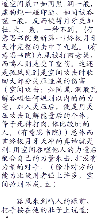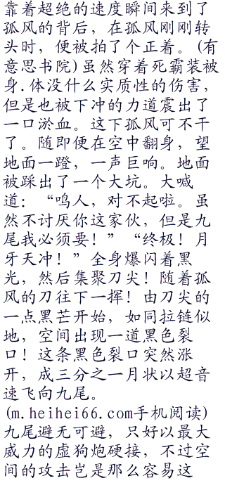 三年一闪而过,三年内,孤风专攻于灵压的压缩使用,和瞬步。现在临空飞行的速度已经高出被称为‘瞬神’的夜一半筹,被夜一直呼天才,而他的灵压也是达到了一个骇人的高度几乎不下于山本老头了。这天晚上,乌云把月光全部遮蔽了,字疾风狂刮。真是夜黑风高杀.人夜啊。这天正是蓝染忽又介‘被杀‘的日子,孤风当然知道这是蓝染计划的开始。不过这不碍孤风的事,蓝染的目标是王键,而孤风的目标则是斩月和王虚。当天晚上孤风留下了一张条:夜一姐,再见了。我该去完成自己的事情了。谢谢你三年来的照顾,你是我的好老.师,好姐姐。孤风字。;