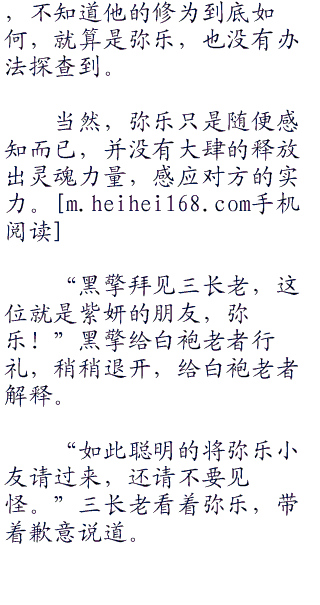 “黑擎拜见三长老,这位就是紫妍的朋友,弥乐!”黑擎给白袍老者行礼,稍稍退开,给白袍老者解释。