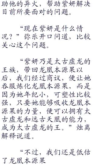 “紫妍乃是太古虚龙的王族,带回龙凰本源果以后,我们经过商议,便让她吞服炼化龙凰本源果,而是因为她年纪小,可塑性比较强,只要她能够吸收龙凰本源果的力量,便可以拥有太古虚龙和远古天凰的能力,成为太古虚龙的王。”烛离解释说道。