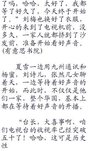 吃完了饭,短暂的休息后,又开始拍摄了,《野蛮师姐》在顺利地进行中,而此时,华国的华国好声音也要重磅开播了。
