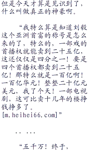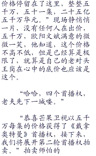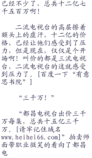 虽然已经看过了文件,知道是这个价钱,但是在听到这个价格的时候,很多电视台的台长都是心中一颤,一千万每集,五十一集就是五亿一千万,这个价格,瞬间就能够让所有三流电视台望之兴叹,这部电视剧也太特么贵了吧!
