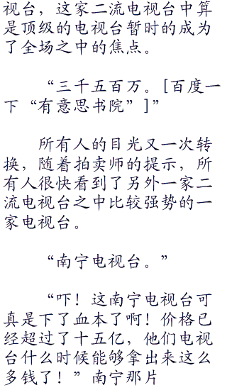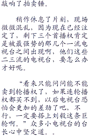 只有一流电视台的工作人员还在淡定的看着竞拍台上的主持人员,手里有钱,心中不慌,说的就是这个道理吧。