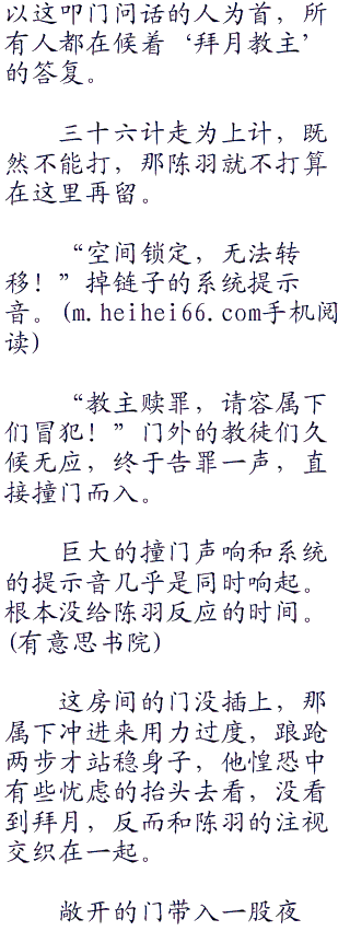 “教主,教主你没事吧!”脚步声很快被急切的敲门声代替,一个焦急关
