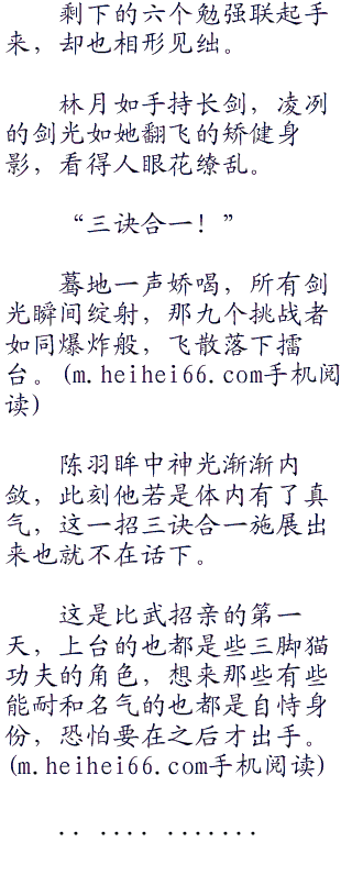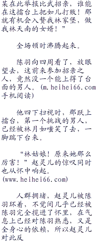 “既然你如此顽固,那我也告诉你!有我在你休想出了林家堡的大门,你要不想嫁!那就在比武招亲上见真章!只要你能把那些挑战者全打败了,那爹以后就再也不逼你!”