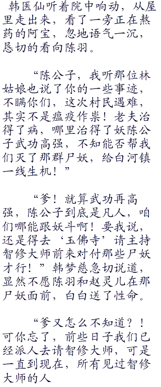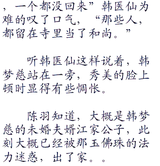 “好的,我们这就去做!”陈羽客套了两句,带着灵儿就出了韩医仙的屋子。