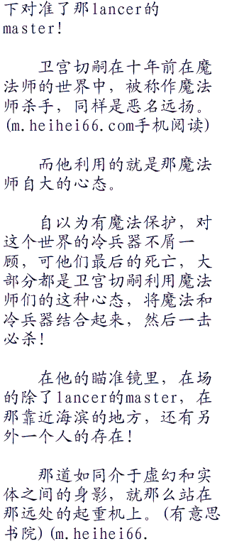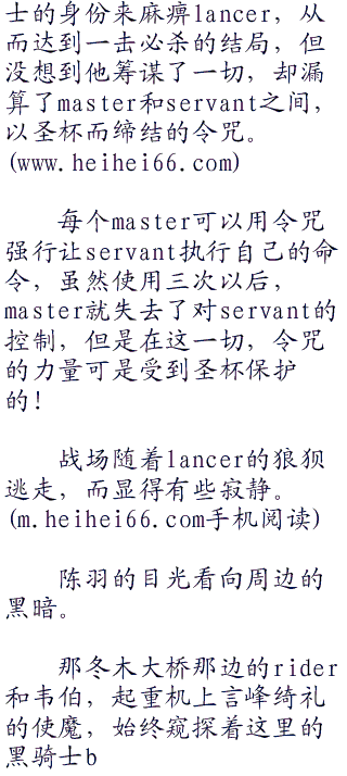 黑暗中的声音骤然响起,lancer骤然退后拉开了距离,尊敬的口吻中,他随手将自己左手中的短枪扔在了脚下。
