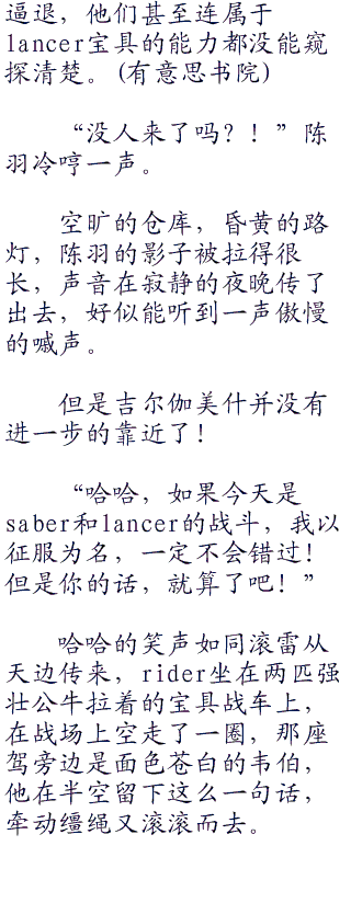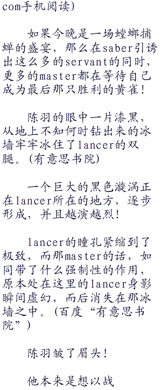 陈羽知道saber的必杀技就属于后一种,而陈羽了解的lancer,毫无疑问,必杀技就属于第二种。