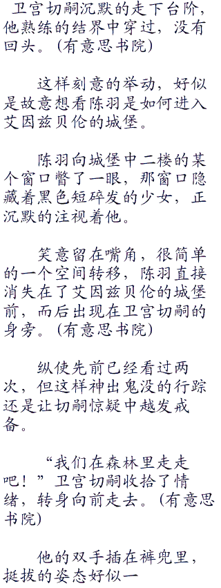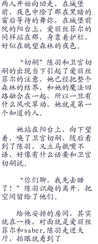 陈羽直接以空间转移再次出现在城堡前的时候,切嗣站在城堡的门口的台阶上,有些居高临下的注视着陈羽。
