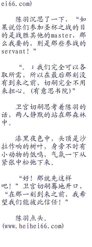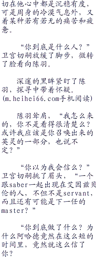 “我们该谈谈了,陈羽。”卫宫切嗣语气微凝的说道。
