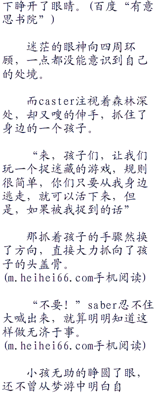 caster带着一群人,大概有十几个,他们在森林中大步走着,那自在的神情好像是来森林中游玩,但那十几个小孩脸上那梦游般的神情,却充分说明,这些都是被caster所控制的孩子。